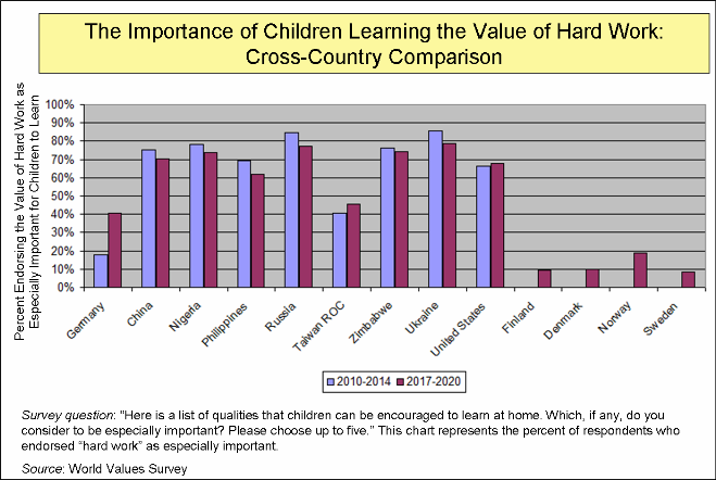 Interesting. These surveys show a link between subjective values and real-world conditions. To wit: people living in high-tax countries work fewer hours and value work less than those living in countries that tax less. I assume the high-tax countries spend much of their tax revenue on maintaining a solid safety net and that people living in these countries are less afraid of falling into abject poverty than in countries lacking such protection. Perhaps a strong work ethic develops in response to this fear (among other things).