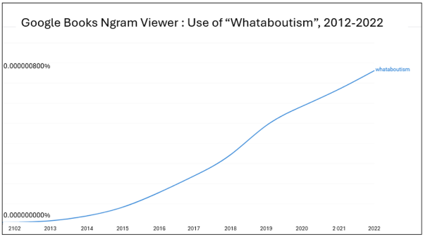 However, there’s no doubt that use of the word ‘whataboutism’ has skyrocketed in print over the past decade:
