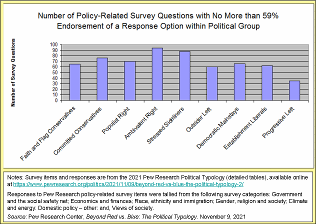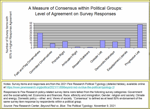 Pew Research interviewed thousands of Americans in 2021 and assigned each to a political group based on their responses to questions about social and political values. So how can one tell if the individuals in any of these groups are subject to groupthink? One way is to look at the level of consensus within a political group - especially on policy-related questions.