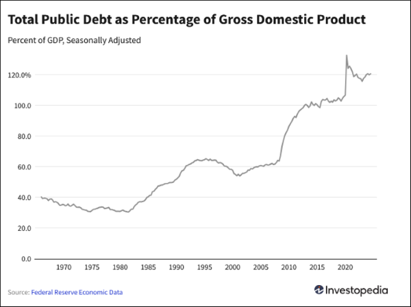 Chart: U.S. National Debt by Year, by Hiranmayi Srinivasan/Investopedia. Updated May 25, 2025. Link: https://www.investopedia.com/us-national-debt-by-year-7499291