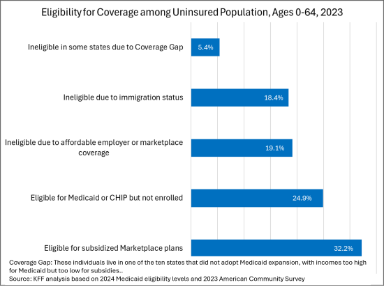 A universal healthcare system could be established in the U.S. by leveraging existing structures like Medicare, Medicaid, and the insurance industry, using a range of provider and consumer incentives to control costs. Our current system already covers around 92% of the U.S. population under age 65 - only 8% to go!. That seems eminently doable, especially considering that over half the currently uninsured are actually eligible for healthcare coverage but simply have not enrolled in a government program. The rest are ineligible for government assistance, mostly due to immigration status or affordable alternatives given their income. Here’s the breakdown: