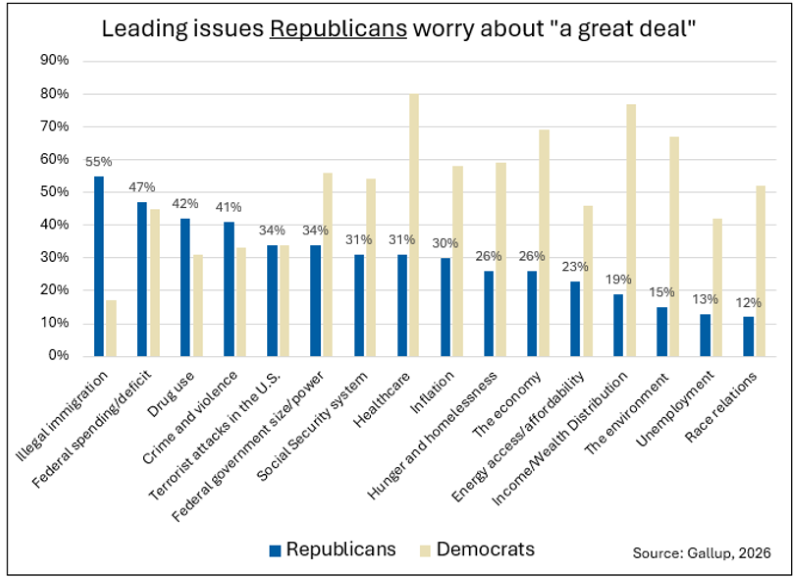 What’s up with Republicans? Don’t they care enough to worry much about important national issues? Maybe. It may also be that Republicans are simply optimistic that the problems listed in the survey can be fixed, or at least managed better, when Republicans are in charge. Which they are.